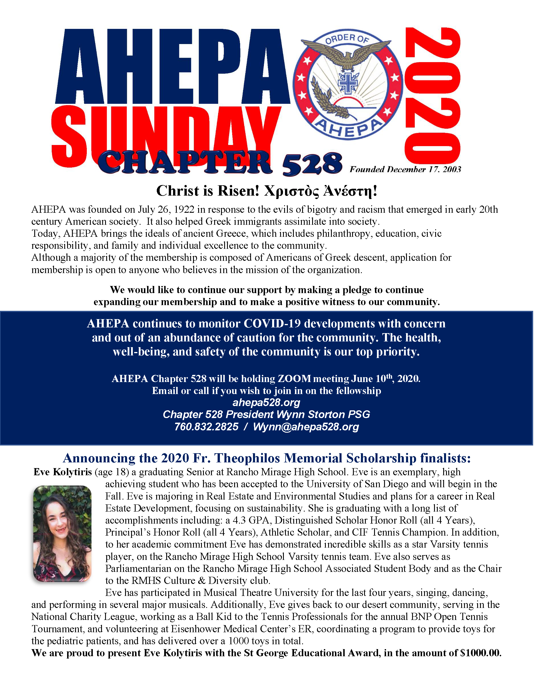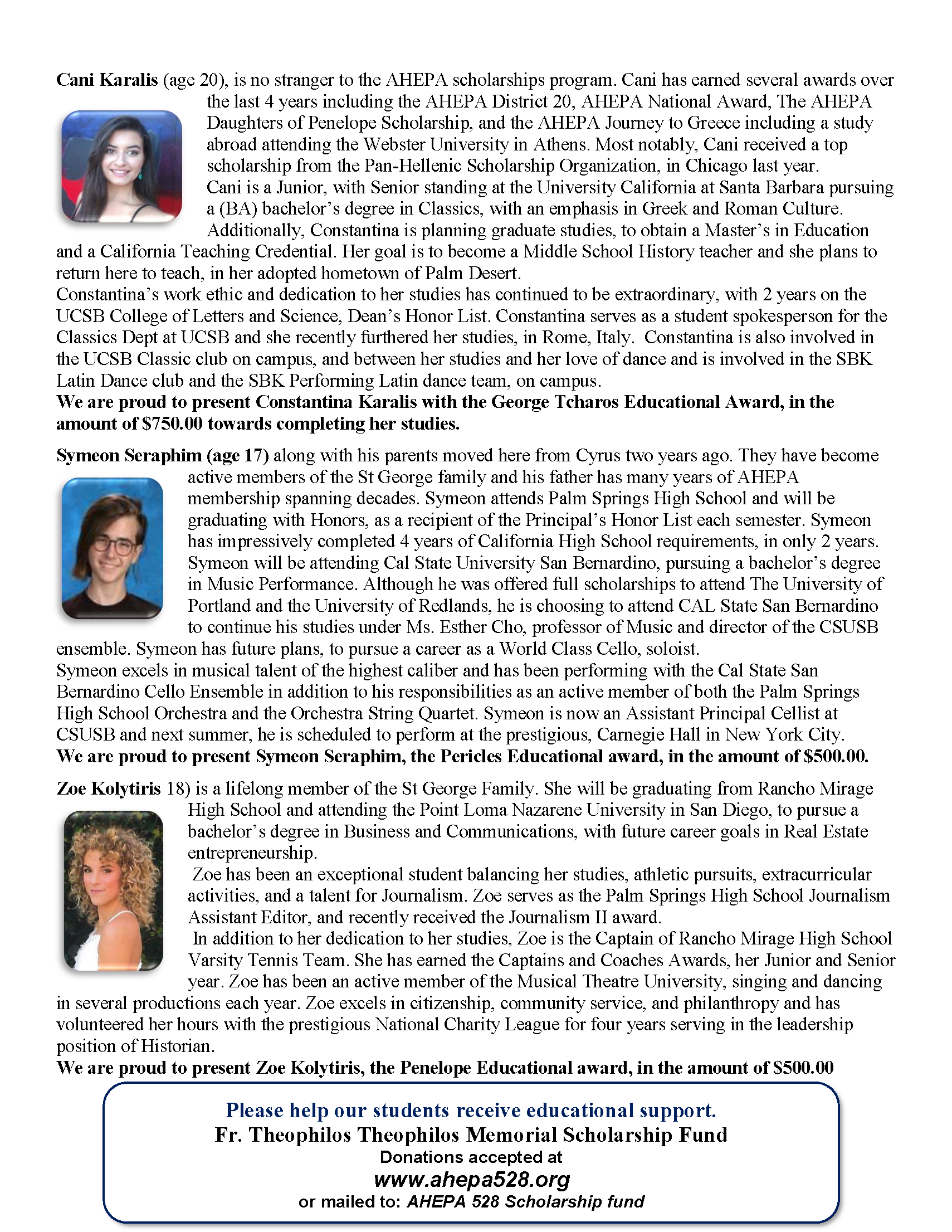The 2020 AHEPA 528 Fr. Theophilos Theophilos Memorial Scholarship Finalist are: